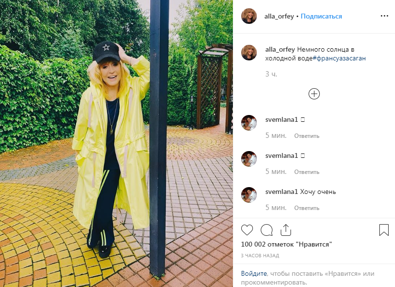 На Пугачевой - кепка со звездой, яркий желтый плащ оверсайз, свободные черные штаны с продольными полосами и такого же цвета футболка. Образ завершает крупный кулон на длинной цепочке и браслет. Певица облокачивается на столб и улыбается. На фоне - зелень, снимок, очевидно, сделан после дождя.