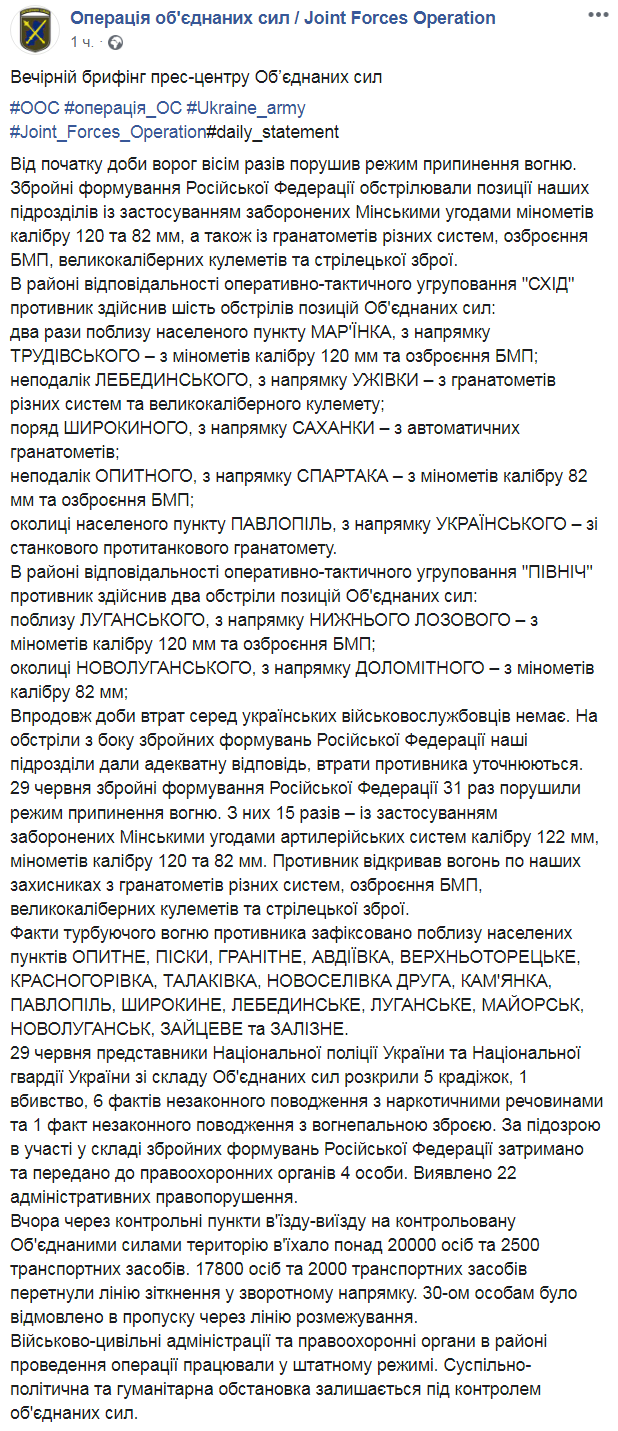 27 июня в штабе ООС рассказали, что противник начал выполнять отвод своих сил.