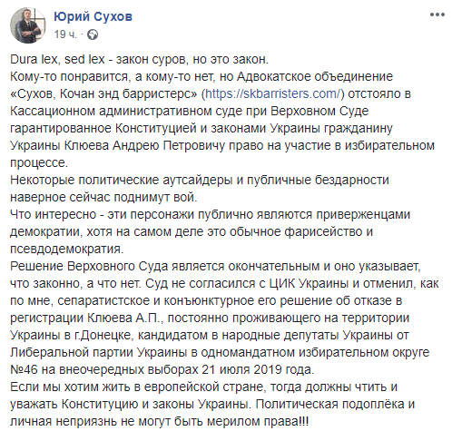 "Суд не согласился с ЦИК Украины и отменил, как по мне, сепаратистское и конъюнктурное его решение об отказе в регистрации Клюева, постоянно проживающего на территории Украины в Донецке, кандидатом в народные депутаты Украины от Либеральной партии Украины в одномандатном избирательном округе №46 на внеочередных выборах 21 июля 2019 года", - написал Сухов и отметил, что решение Верховного Суда является окончательным.