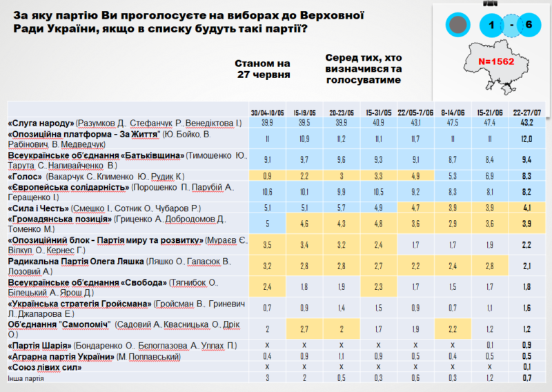 Кроме двух лидеров списка, на внеочередных выборах в Раду 21 июля попадают ВО "Батькивщина" Юлии Тимошенко, "Голос" Святослава Вакарчука и "Европейская солидарность" Петра Порошенко. Такие данные показало исследование, проведенное шестью волнами. Последняя из них датируется 22-27 июня.