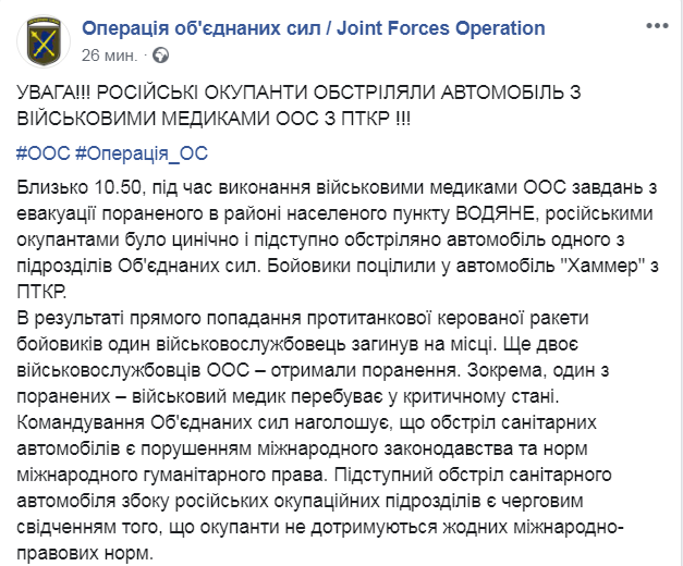 Отмечается, что обстрел произошел около 10:50 во время выполнения военными медиками ООС задач по эвакуации раненого в районе населенного пункта Водяное.