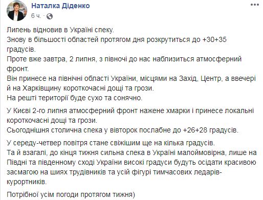 Сегодня, 1 июля, в большинстве областей Украины возобновится жара до +30...+35 градусов, но со вторника воздух немного посвежеет. Об этом в Facebook сообщила синоптик Наталья Диденко.