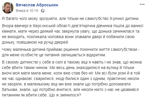 В своем детстве у себя в деревне в таком возрасте я даже и не знал, что можно себя убить таким образом. Мы весь день находились на улице и ночью моя мать мыла меня, когда спал без ног. Мы все были разные и в то же время одинаковые: ссорились, иногда дрались друг с другом, практически никогда не болели, в маленьком возрасте мы уже знали что нужно помогать родителям, знали, что нужно учиться, но никогда никто из нас не интересовался вопросом как убить себя. Что же изменилось?", - говорится в опубликованном сообщении.