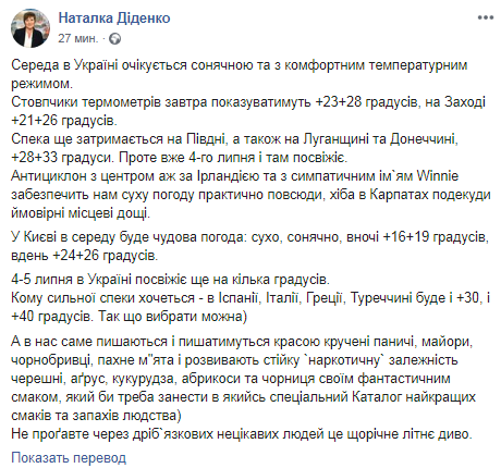 По ее словам, в Киеве в среду будет прекрасная погода: сухо, солнечно, ночью +16...+19 градусов, днем +24...+26 градусов. Также Наталья Диденко сообщила, что 4-5 июля в Украине посвежеет еще на несколько градусов.