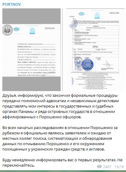 "Друзья, информирую, что закончил формальные процедуры передачи полномочий адвокатам и независимым детективам представлять мои интересы в государственных и судебных органах Панамы и ряда островных государств в отношении аффилированных с Порошенко офшоров", - заявил Портнов.