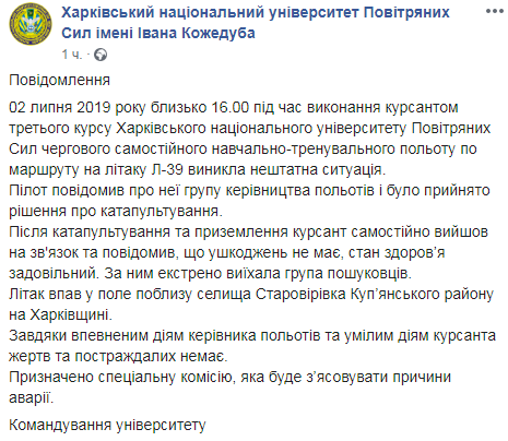 Во время выполнения курсантом третьего курса Харьковского национального университета Воздушных Сил им. Ивана Кожедуба очередного самостоятельного учебно-тренировочного полета по маршруту на самолете Л-39 возникла нештатная ситуация.