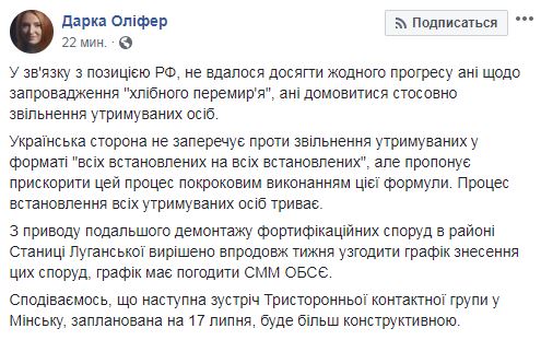 Сегодня, 2 июля, на переговорах трехсторонней контактной группы в Минске не удалось достичь никакого прогресса ни по внедрению "хлебного перемирия", ни по освобождению удерживаемых лиц.