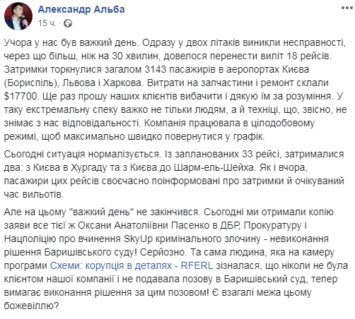 Ко вторнику, 2 июля, в украинской авиакомпании-лоукостере SkyUp удалось нормализовать работу после задержки 18 рейсов, связанной с поломкой сразу двух самолетов, и выполнить большинство своих авиарейсов в штатном режиме. Об этом говорится на фб-странице акционера компании Александра Альбы.