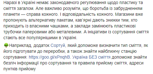 "Сейчас в Украине нет законодательного регулирования по пластику и мусору в целом. Но важно понимать, что борьба с загрязнением планеты - дело каждого. И ответственность каждого. Магазины уже предлагают альтернативу пакетам, кафе дают скидки тем, кто приходит с собственными чашками, а заведения заменяют пластиковые трубочки бумажными или металлическими. А инициативы по сортировке мусора становятся все популярнее в Украине", - говорится в сообщении.