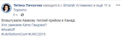 "Устроили Авакову теплый прием в Канаде. Кто заказал Катю Гандзюк?", - написала она. Активисты подняли плакаты "Кто заказал Катю Гандзюк?", когда на сцене мероприятия находился министр внутренних дел Украины Арсен Аваков.