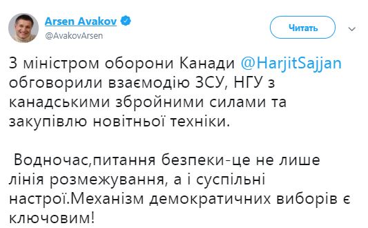 Сам Аваков на своей странице в Twitter сообщил, что встречался с министром обороны Канады, с которым обсудил взаимодействие ВСУ, НГУ с канадскими вооруженными силами и закупку новой техники.