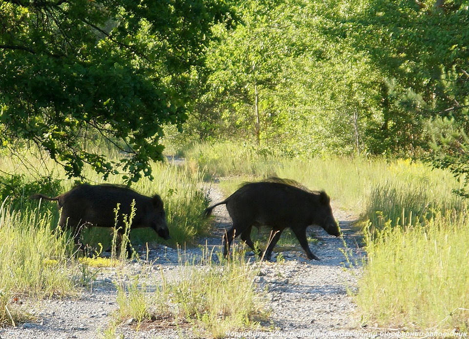 В соцсети опубликовали фото диких кабанов, которые разгуливают по территории Чернобыльской зоны отчуждения. Снимок опубликован на странице Чернобыльского радиационно-экологического биосферного заповедника. В объектив фотографа попали две особи, которые в пустынной и покрытой буйной растительностью местнности переходят заросшую травой дорогу.