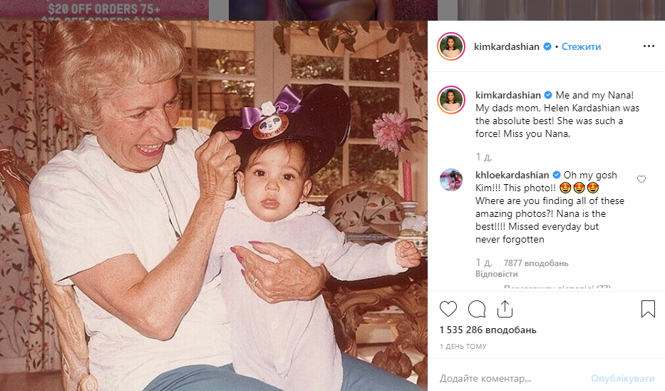 Звезда реалити-шоу 38-летняя Ким Кардашьян на своей странице в Instagram поделилась своей детской фотографией. На опубликованном снимке маленькая Кардашьян сидит на руках у своей бабушки Хелен. На голове у малышки головной убор в виде ушей Микки Мауса.
