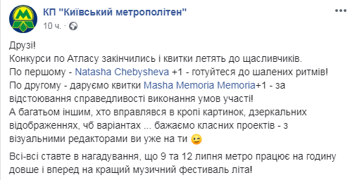 "Все-все ставьте в напоминание, что 9 и 12 июля метро работает на час дольше и вперед на лучший музыкальный фестиваль лета", - говорится в заявлении КП "Киевский метрополитен" в сети.