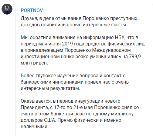 "Мы обратили внимание на информацию НБУ, что в период мая-июня 2019 года средства физических лиц в принадлежащем Порошенко Международном инвестиционном банке резко уменьшились на 799,9 млн гривен. Более глубокое изучение вопроса и контакт с банковскими чиновниками привел нас с очень интересным результатам.