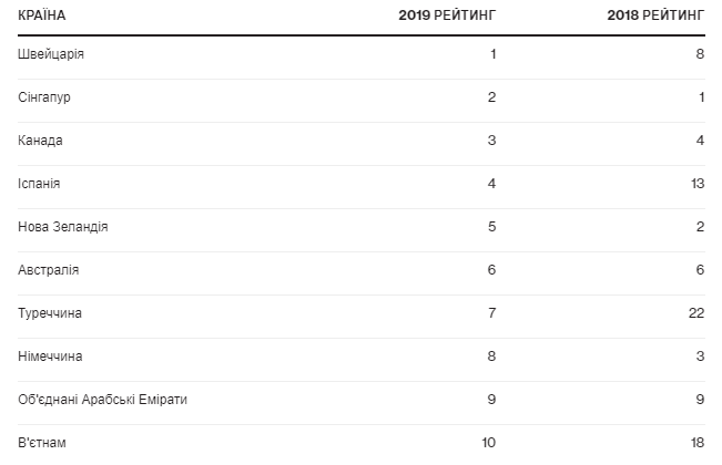На втором месте оказался Сингапур, который до этого возглавлял этот рейтинг на протяжении последних четырех лет. Третью строчку заняла Канада. В первую десятку также вошли Испания, Новая Зеландия, Австралия, Турция, Германия, Объединенные Арабские Эмираты (ОАЭ) и Вьетнам.