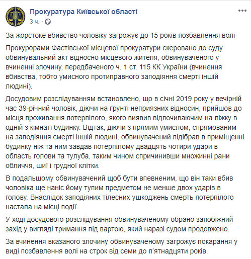 Отмечается, что злоумышленника обвиняют по ч. 1 ст. 115 УК Украины (совершение убийства, то есть умышленного противоправного причинения смерти другому человеку). За убийство ему грозит до 15 лет лишения свободы.