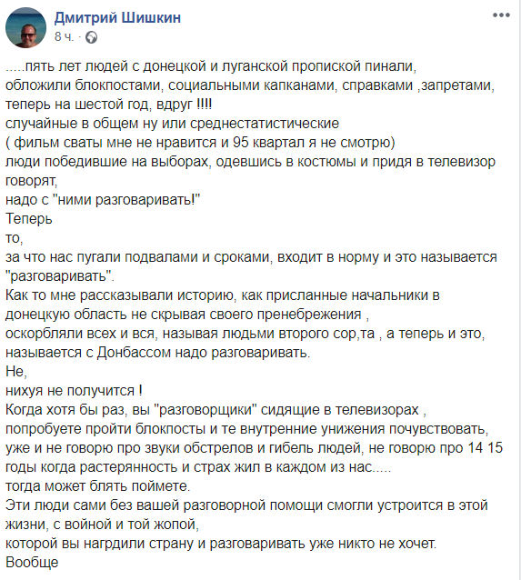 Эти люди сами без вашей разговорной помощи смогли устроится в этой жизни, с войной и той жопой, которой вы нагрдили страну и разговаривать уже никто не хочет. Вообще", - пишет в Facebook донецкий журналист Дмитрий Шишкин, живущий в Киеве.