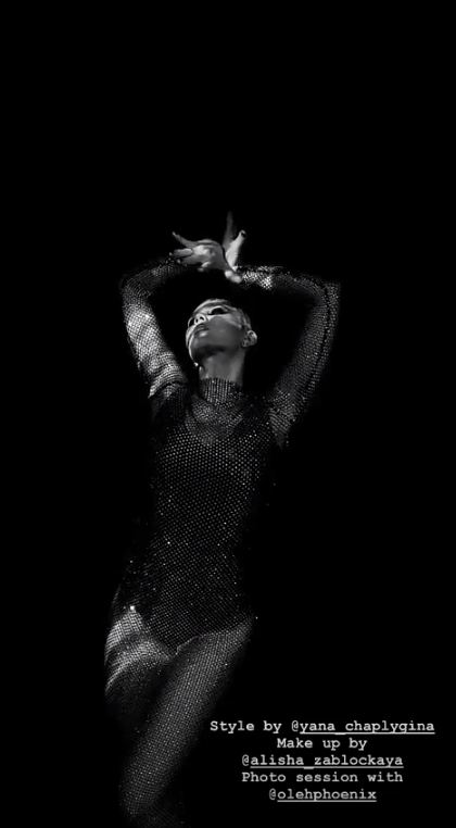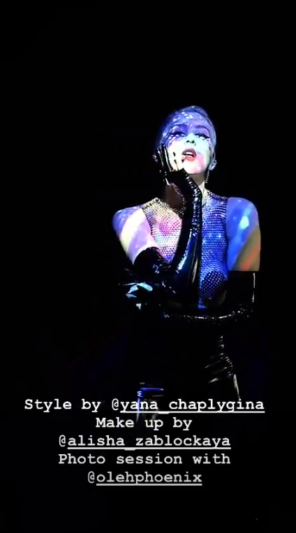 В фотосессии певица позирует в латексных костюмах, боди-сеточках и трико. При этом латексные трико не скрывают ее грудь.