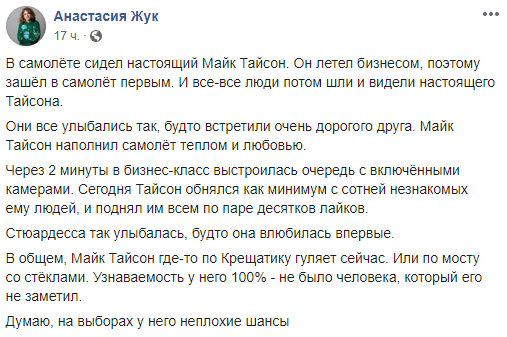 "В самолёте сидел настоящий Майк Тайсон. Он летел бизнесом, поэтому зашёл в самолёт первым. И все-все люди потом шли и видели настоящего Тайсона. Они все улыбались так, будто встретили очень дорогого друга. Майк Тайсон наполнил самолёт теплом и любовью. Через 2 минуты в бизнес-класс выстроилась очередь с включёнными камерами. Сегодня Тайсон обнялся как минимум с сотней незнакомых ему людей, и поднял им всем по паре десятков лайков.
