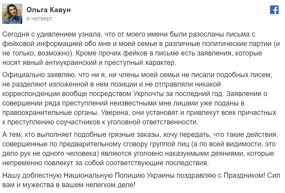Накануне исключения Кавун пожаловалась, что от ее имени неизвестные рассылают письма, в которых она якобы приветствует аннексию Крыма и хвалит российское руководство полуострова. И подала заявление в полицию. Но остаться в списке ей это не помогло.