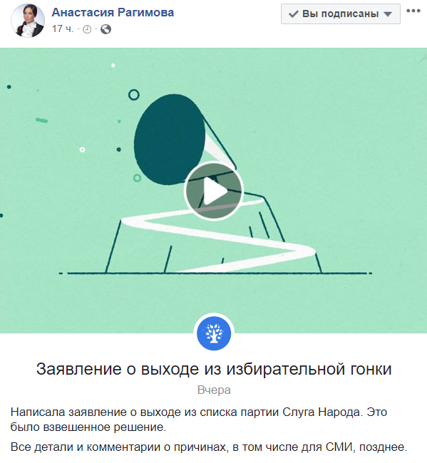Интересно, что Рагимова еще вчера через Facebook заявила, что покидает партсписок по собственному желанию. При этом сегодня в "Слуге народа" заявили, что она была исключена из списка.