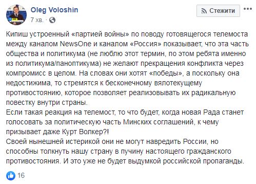 "Кипиш устроенный "партией войны" по поводу готовящегося телемоста между каналом NewsOne и каналом "Россия" показывает, что эта часть общества и политикума (не люблю этот термин, по этом ребята именно из политикума/паноптикума) не желают прекращения конфликта через компромисс в целом. На словах они хотят "победы", а поскольку она недостижима, то стремятся к бесконечному вялотекущему противостоянию, которое позволяет реализовывать их радикальную повестку внутри страны.