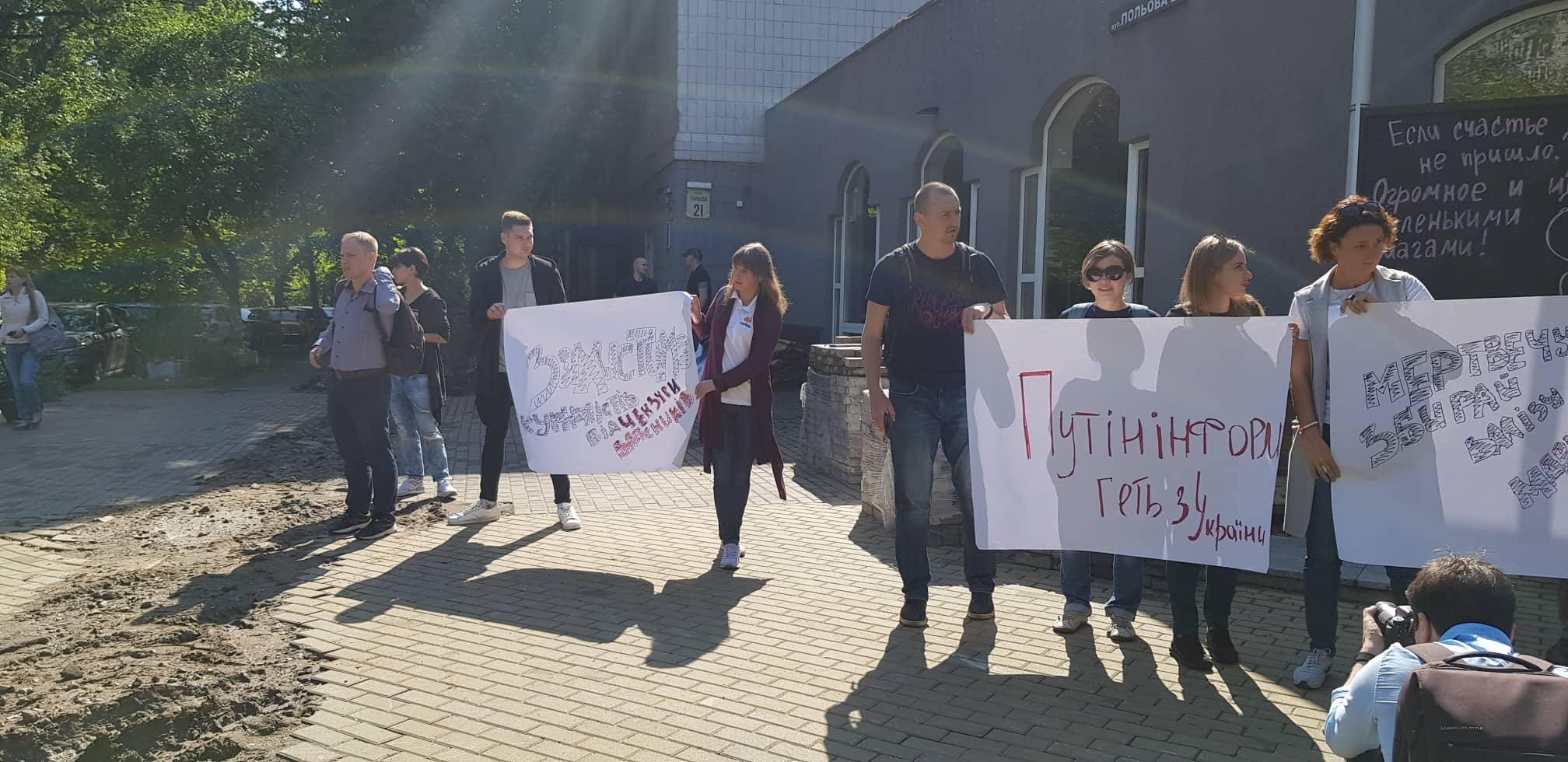 Всего у проходной NewsOne собралось около 30 человек. Они держат в руках плакаты с лозунгами против телемоста. Кричать "Ганьба" и "Путин - геть с Украины". На противоположной улице виднеется баннер с изображением лица лидера политической партии "Голос" Святослава Вакарчука.