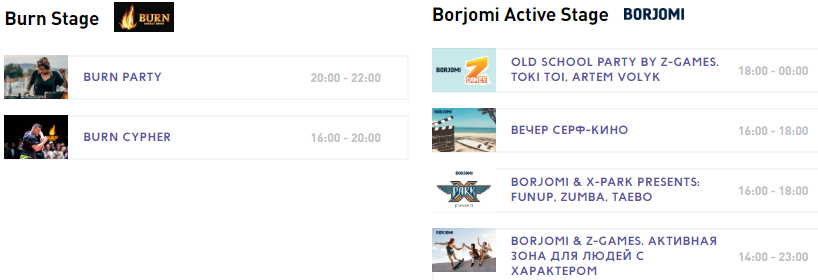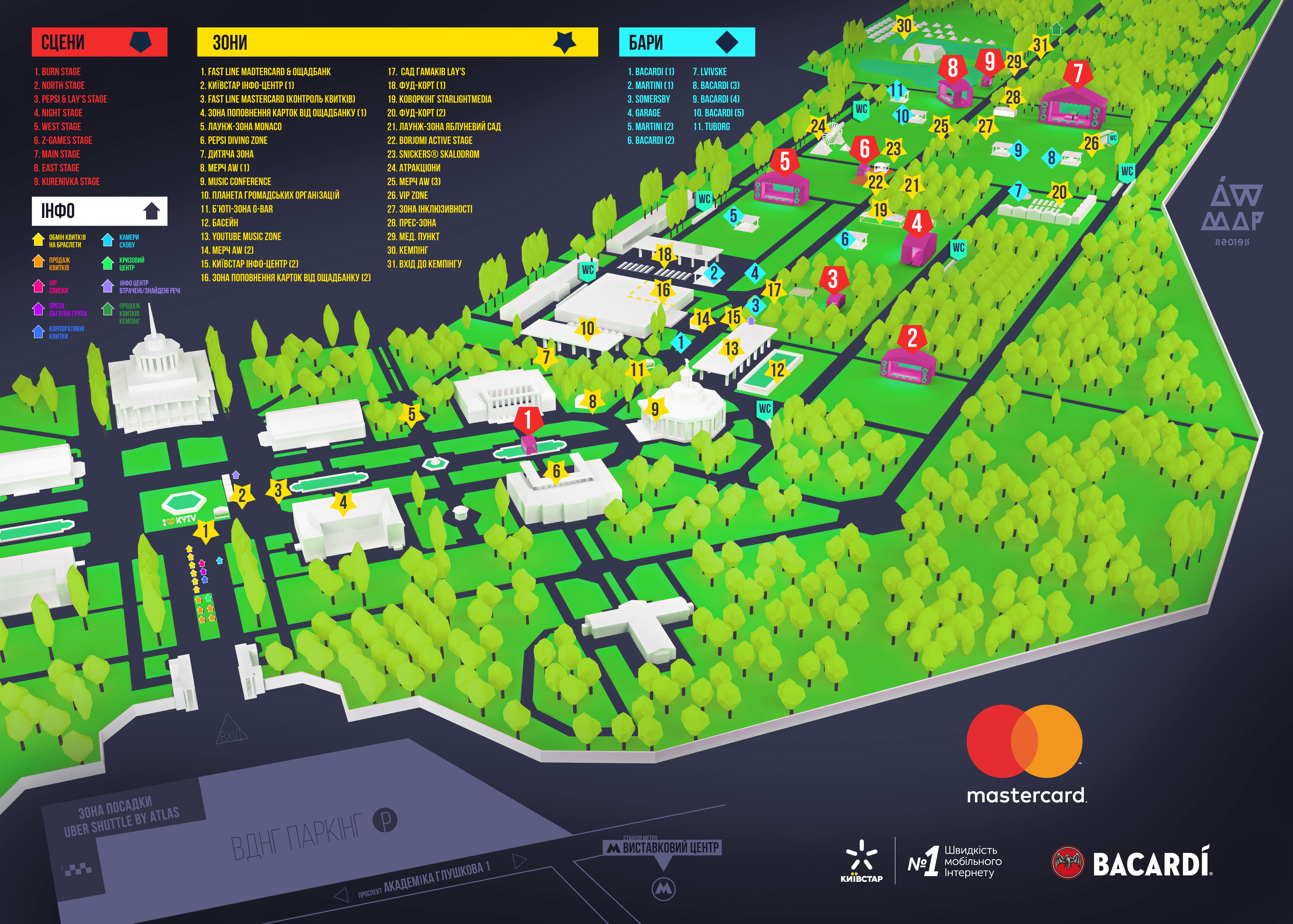 1 - Burn Stage; 2 - North Stage; 3 - Pepsi & Lays Stage; 4 - Night Stage; 5 - West Stage; 6 Z-games Stage; 7 - главная сцена; 8 - East Stage; 9 - Kurenivka Stage