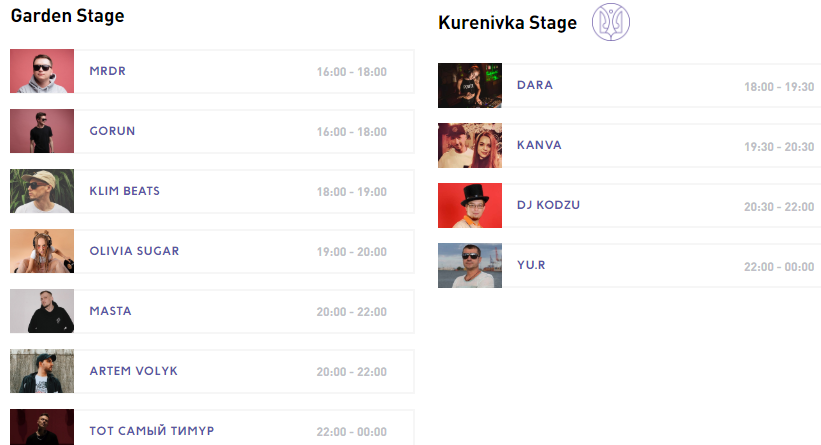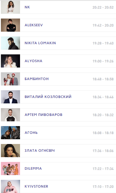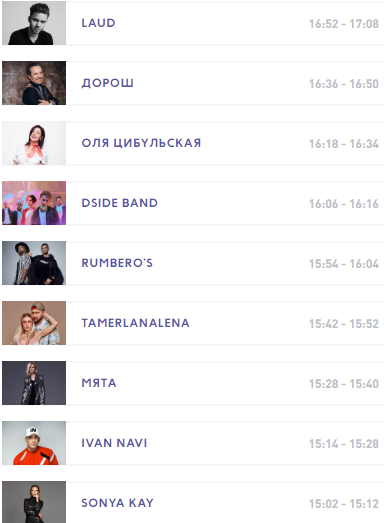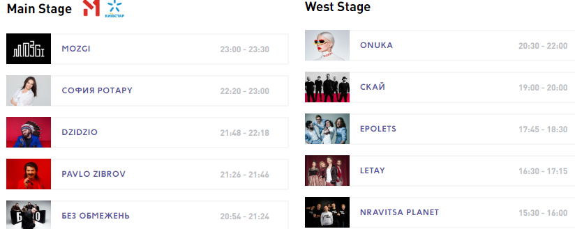 Концерт на главной сцене начнется с 15:00. Там выступят украинские исполнители. В числе хедлайнеров первого дня - Mozgi, Сфия Ротару, Настя Каменских, Дзидзьо, Алексеев. На других сценах выступят ONUKA, Скай, O Torvald, YUKO, и другие украинские музыканты.