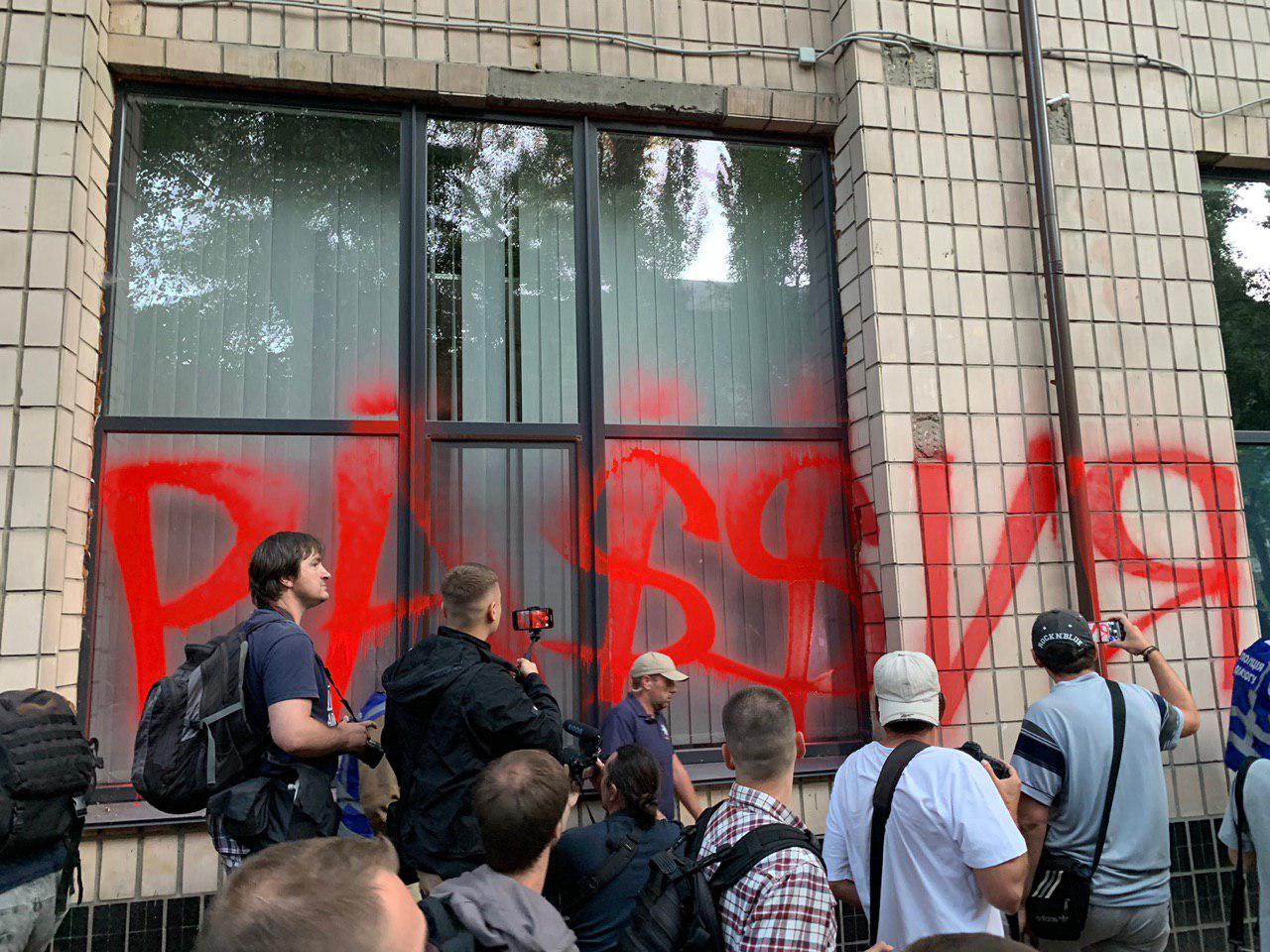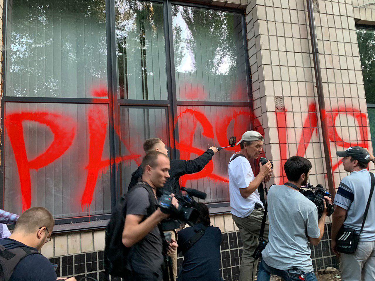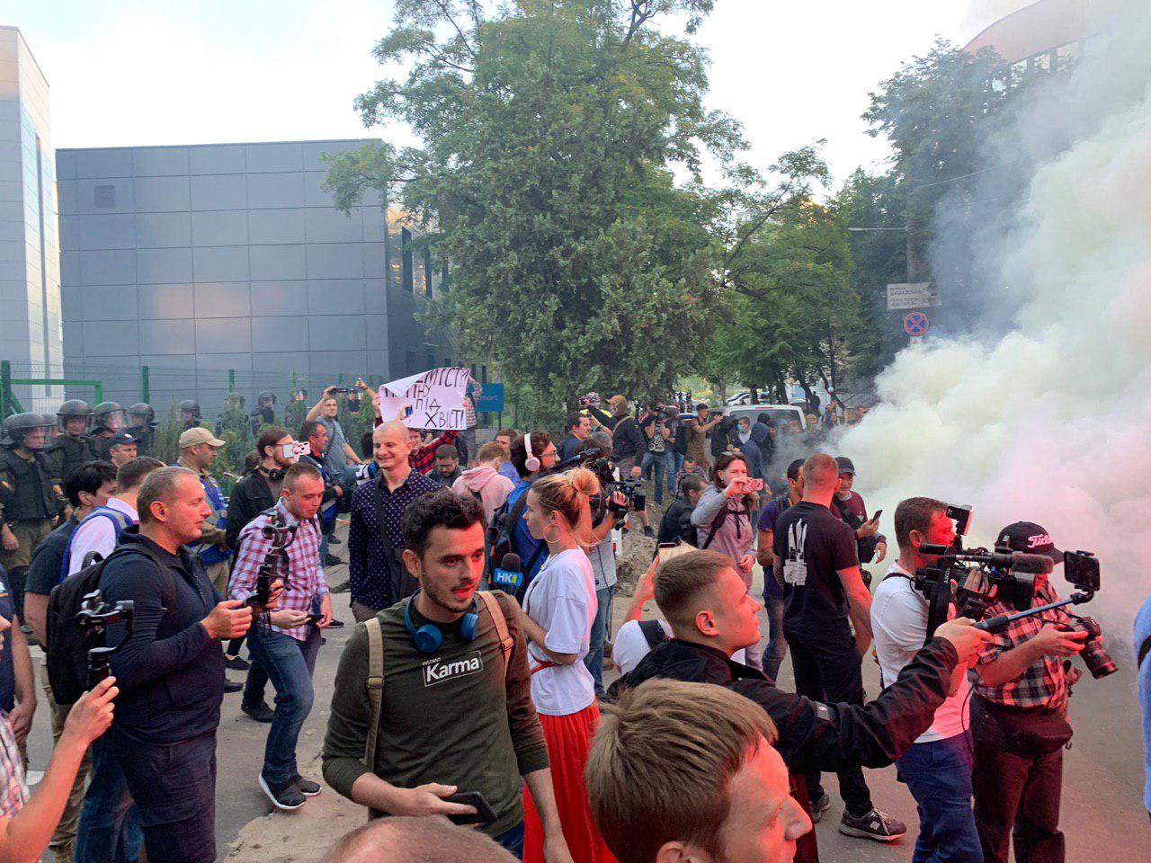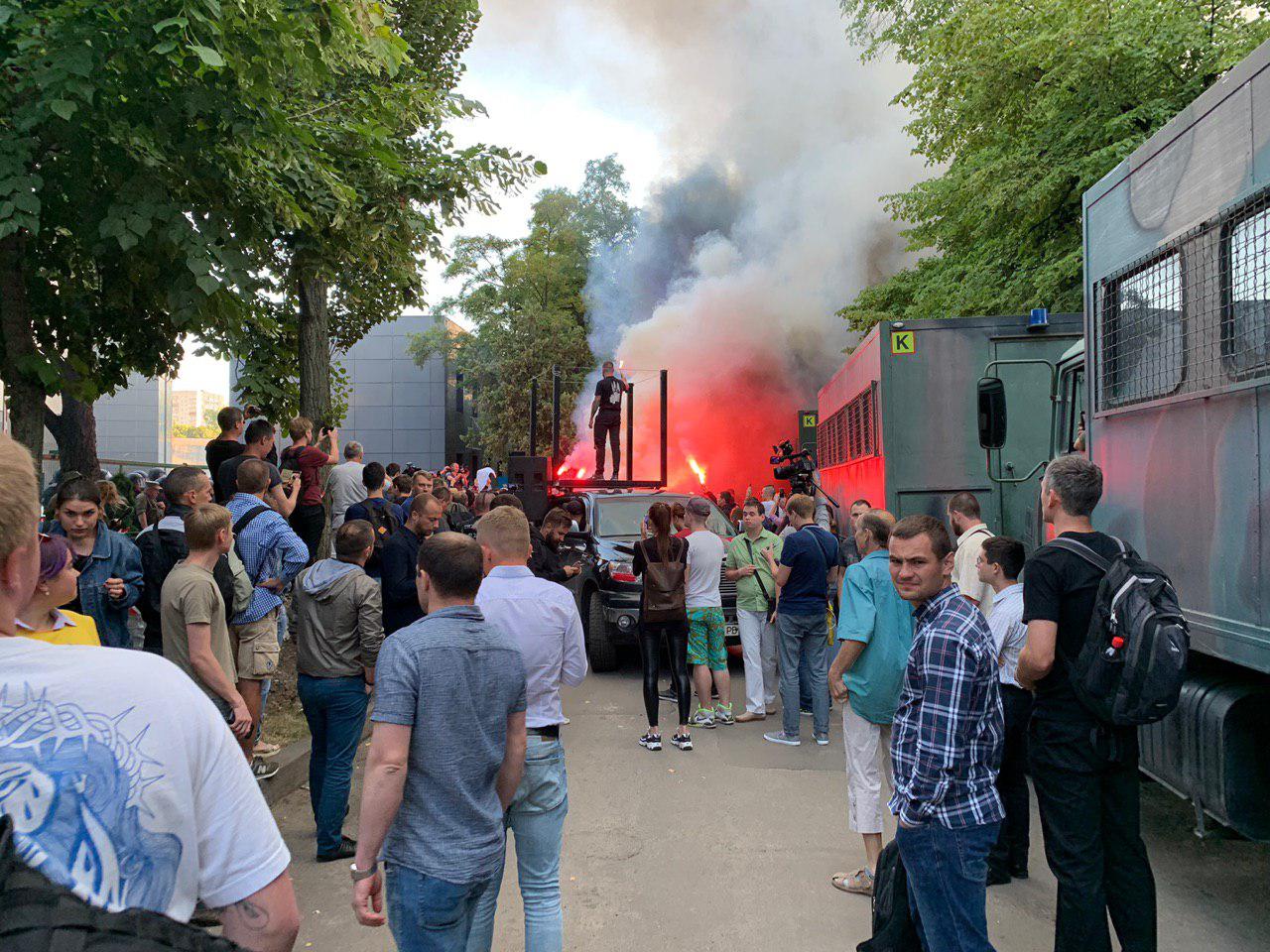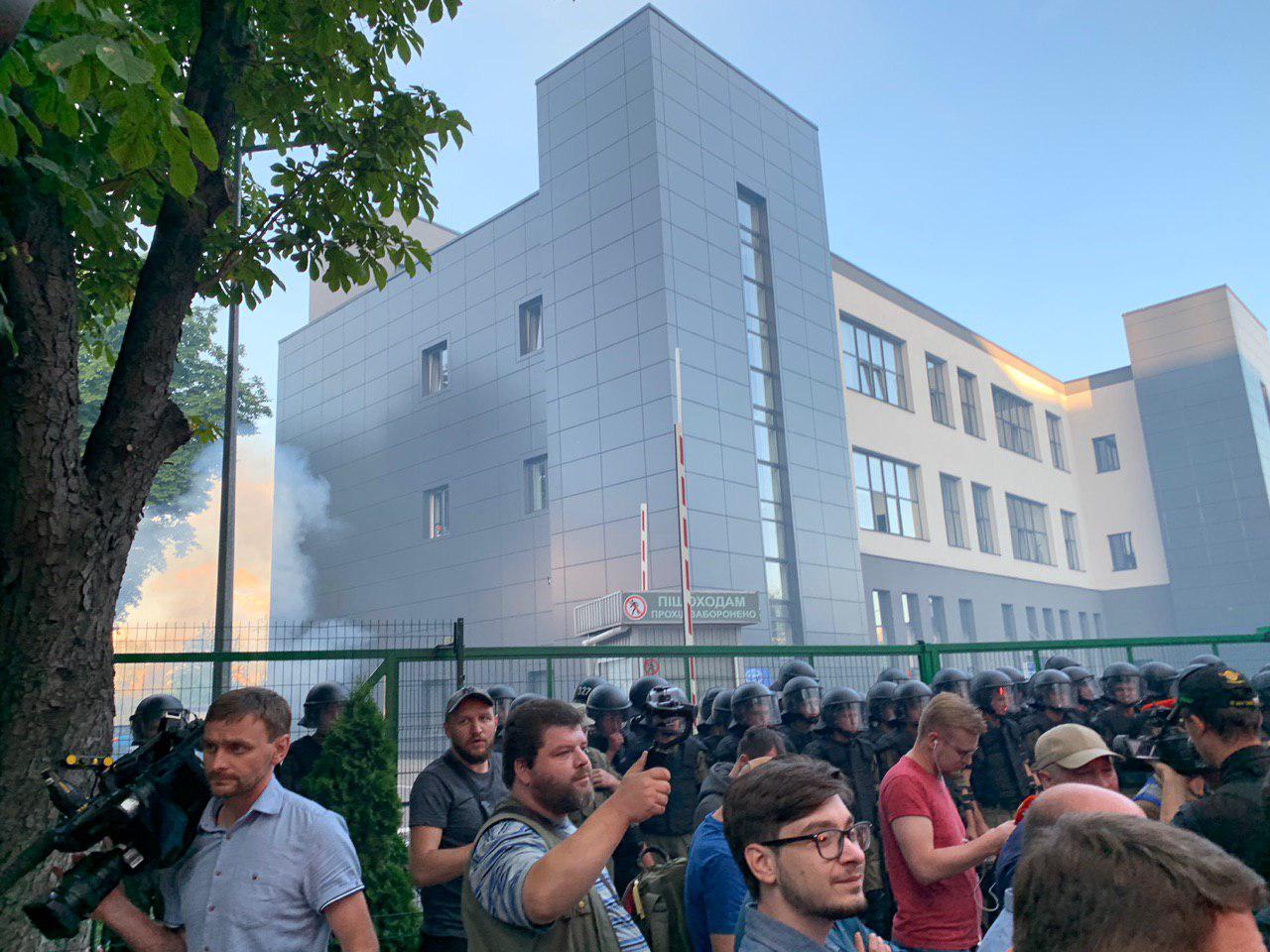 Как сообщает журналист "Страны", у здания канала находятся около трех сотен человек, среди которых члены Нацкорпуса и С14. Националисты жгут фаера, а на территорию комплекса, где расположен телеканал, залетают петарды. На кордоне выстроились бойцы Нацгвардии.