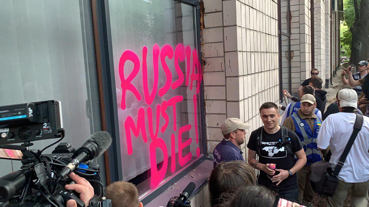 Вечером в понедельник, 8 июля, под зданием телеканала NewsOne в Киеве собрались националисты, которые протестуют против проведения телемоста с российским федеральным каналом "Россия-24", который позже был отменен из-за поступивших в адрес журналистов угроз.