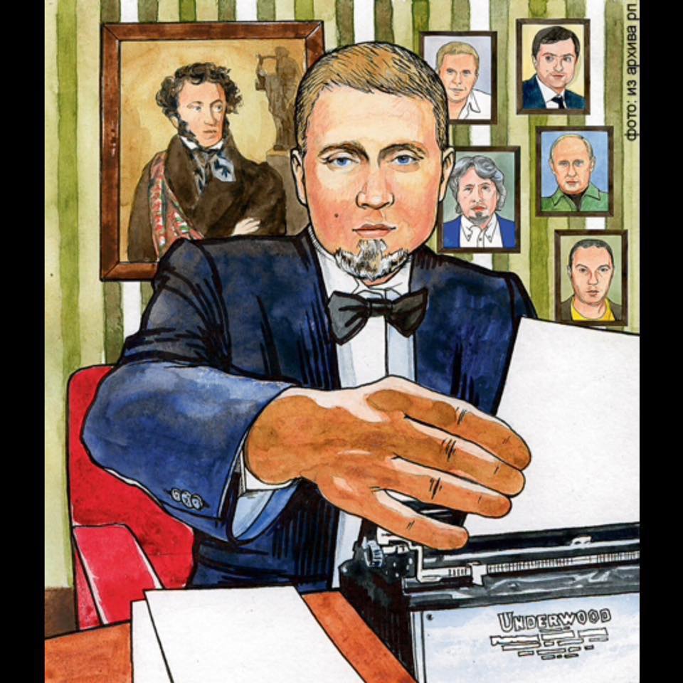 За его спиной на стене висят портреты людей, похожих на Александра Пушкина, непосредственно Владислава Суркова, Владимира Путина, писателей Владимира Сорокина и Виктора Пелевина, а также главреда "Русского пионера" Андрея Колесникова.