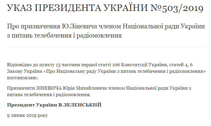 "Назначить Зиневича Юрия Михайловича членом Национального совета Украины по вопросам телевидения и радиовещания", - говорится в документе.