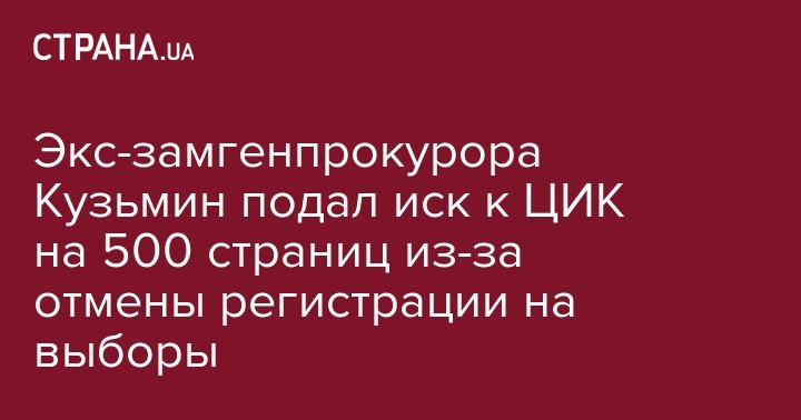 Во вторник, 8 июля, экс-заместитель генпрокурора Ренат Кузьмин подал иск в Шестой апелляционный суд Киева к Центральной избирательной комиссии из-за отмены его регистрации кандидатом в депутаты из списка политсилы "Оппозиционная платформа – За жизнь" на досрочные выборы в парламент 21 июля. Об этом в комментарии "Стране" сообщил адвокат Кузьмина Артем Захаров.