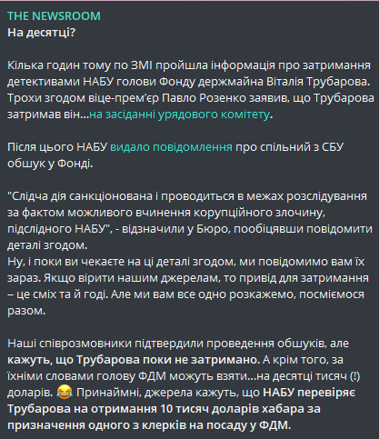 По данным собеседников, обыски в ФГИ действительно проводились, как ранее уже подтверждали в НАБУ. Однако Трубарова пока не задержали. В данный момент НАБУ проверяет его на получение 10 тысяч долларов взятки за назначение одного из клерков на должность в ФГИ.