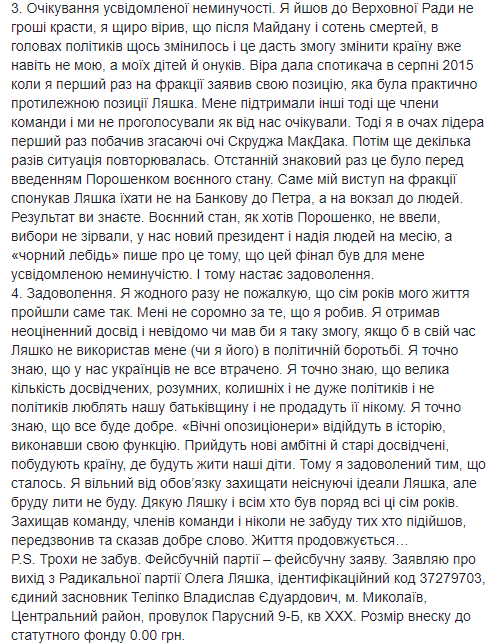P.S. Чуть не забыл. Фейсбучной партии-фейсбучное заявление. Заявляю о выходе из Радикальной партии Олега Ляшко, идентификационный код 37279703, единственный учредитель Телипко Владислав Єдуардович, м. Николаев, Центральный район, переулок Парусный 9-Б, кв ХХХ. Размер взноса в уставный фонд 0.00 грн", - написал на своей странице в Facebook Олег Куприенко.