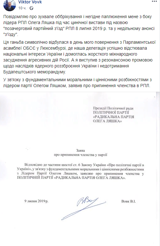 "Этот позор символично состоялась в день моего возвращения из Парламентской ассамблеи ОБСЕ в Люксембурге, где наша делегация успешно отставала национальные интересы Украины и добилась жесткого международного осуждения агрессивных действий России. А я выступил с резонансной речью относительно последствий ядерного разоружения Украины и несоблюдения Будапештского меморандума. В связи с фундаментальными моральными и ценностными разногласиями с лидером партии Олегом Ляшко, заявил о прекращении членства в РПЛ", - написал Вовк.