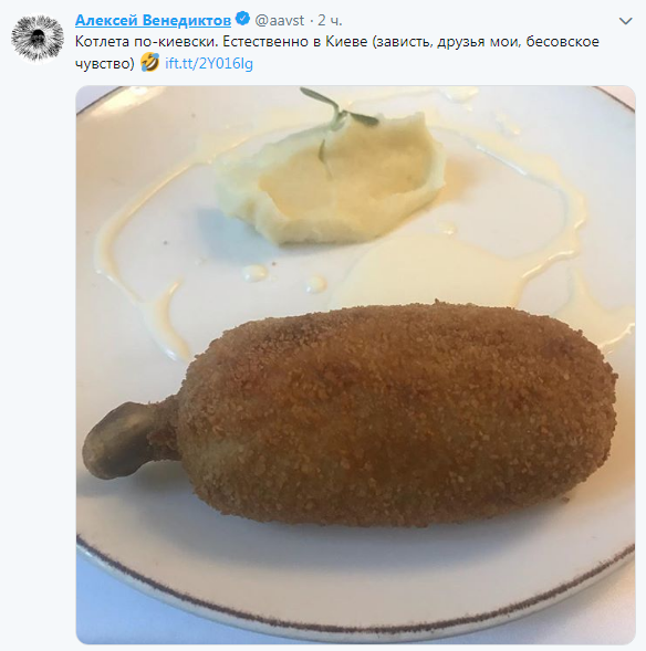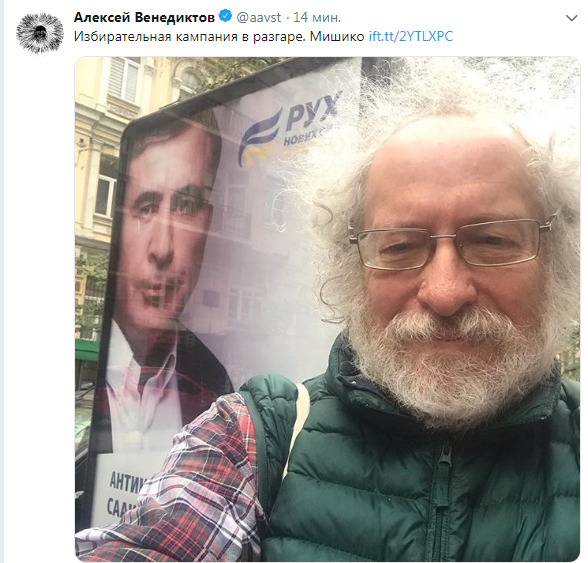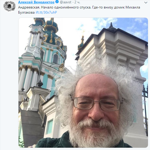 А со своими подписчиками в Twitter главред "Эха Москвы" активно делится фотографиями, сделанными в столице Украины. Первым был снимок котлеты по-киевски, после нее он выложил сэлфи на фоне Андреевской церкви. Также Венедиктов сфотографировался с предвыборным бордом Саакашвили, судя по снимкам, прогулялся по Крещатику и Майдану Независимости.