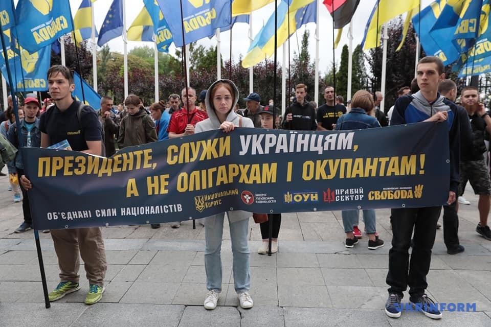 Митингующие держат плакаты с надписями: "Нет - торговле украинской землей!", "Украина - превыше всего!", "Выбор нации - украинизация, декоммунизация, люстрация!", "Украина - превыше всего! Президент, служи украинцам, а не олигархам и оккупантам! ".