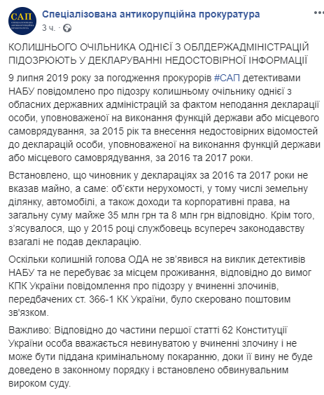 Отмечается, что 9 июля прокуроры САП согласовали, а детективы Национального антикоррупционного бюро объявили чиновнику подозрение. Как утверждает следствие, он не подал декларацию за 2015 год и внес недостоверные данные в декларации за 2016 и 2017 годы.