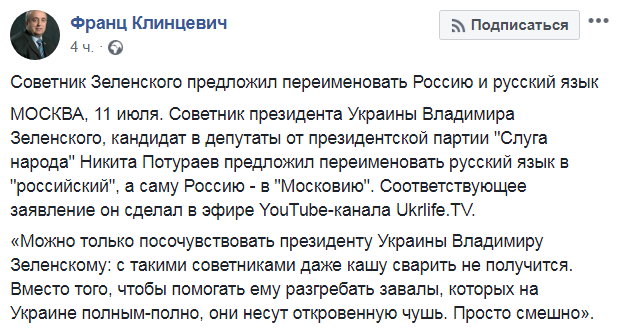 В Российской Федерации быстро отреагировали на слова Потураева. Член Совета Федерации Франц Клинцевич на своей Facebook-странице посочувствовал Зеленскому, вынужденному общаться с помощниками вроде Потураева.