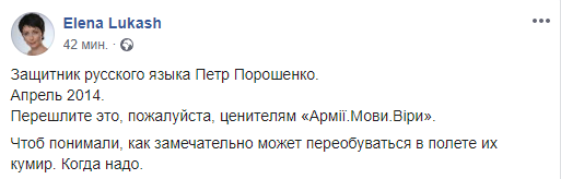 "Защитник русского языка Петр Порошенко. Апрель 2014. Перешлите это, пожалуйста, ценителям "Армії.Мови.Віри". Чтоб понимали, как замечательно может переобуваться в полете их кумир. Когда надо", - написала Лукаш под видео.