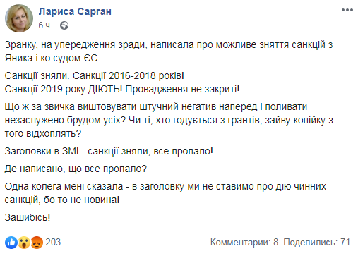 "Санкции 2019 ДЕЙСТВУЮТ! Производства (уголовные дела - Прим.Ред.) не закрыты!