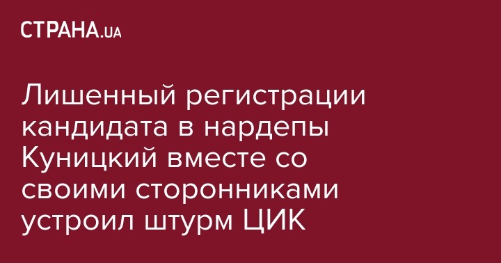 Александр Куницкий, которому ЦИК отменила регистрацию кандидата на выборах Верховной Рады от партии "Слуга народа" по 169 округу и его сторонники взяли штурмом Центральную избирательную комиссию. Об этом сообщают "Вести".