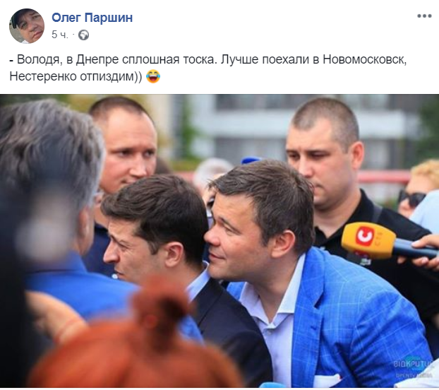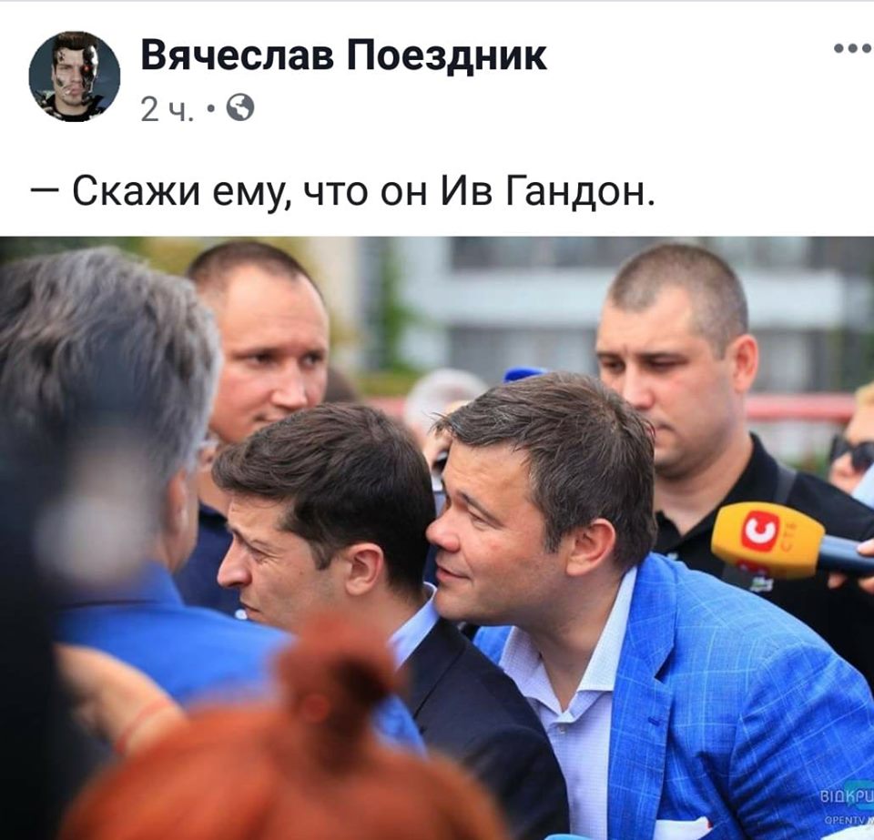 Пользователи соцсети Facebook придумывают смешные подписи к фотографии президента Украины Владимира Зеленского и главы президентского Офиса Андрея Богдана. Снимок фотографа Алексея Кирьянова опубликовал у себя на странице журналист программы "Схемы" Михаил Ткач.