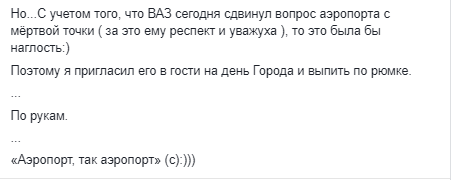 Что взамен, спросите вы? Ведь пари должно быть двухсторонним? Вообще-то я хотел попросить денег для Города:) Ведь нам никто не помогал, а только мешали... Но...С учетом того, что ВАЗ сегодня сдвинул вопрос аэропорта с мёртвой точки ( за это ему респект и уважуха ), то это была бы наглость:) Поэтому я пригласил его в гости на день Города и выпить по рюмке", - написал Филатов.