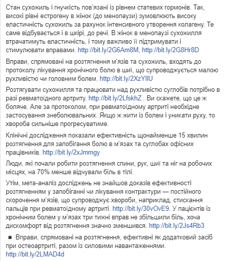"Люди, которые начали делать растяжение спины, рук, шеи и ног на рабочих местах, на 70% меньше испытывали боль в теле. Впрочем, мета-анализ исследований не нашел доказательств эффективности растяжением в предотвращении или лечении контрактуры — постоянного сокращения мышц, что сопровождает болезни, например, сжимание пальцев при ревматоидном артрите. У пациентов с хронической болью в мышцах три недели упражнений не увеличили боль, хотя дискомфорт от растяжения значительно уменьшился", - отмечает Супрун.