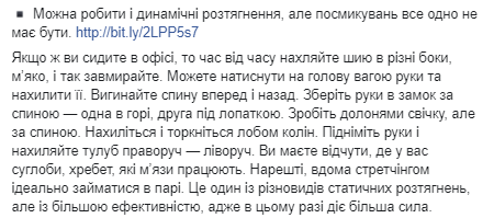"Если же вы сидите в офисе, то время от времени наклоняйте шею в разные стороны, мягко, и так замирайте. Можете нажать на голову весом руки и наклонить ее. Выгибайте спину вперед и назад. Соберите руки в замок за спиной — одна в горе, вторая под лопаткой. Сделайте ладонями свечу, но за спиной. Наклонитесь и коснитесь лбом колен. Поднимите руки и наклоняйте туловище вправо — влево. Вы должны почувствовать, где у вас суставы, позвоночник, какие мышцы работают. Наконец, дома стретчингом идеально заниматься в паре. Это один из разновидностей статических растяжений, но с большей эффективностью, ведь в этом случае действует большая сила", - подытожила и.о. министра.