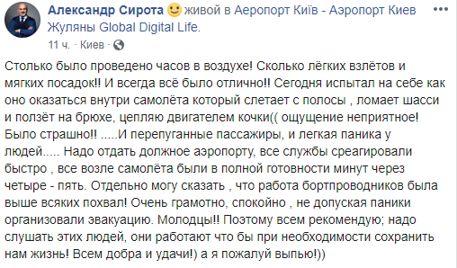 "Сегодня испытал на себе как оно оказаться внутри самолета который слетает с полосы, ломает шасси и ползет на брюхе, цепляя двигателем кочки. Ощущение неприятное! Было страшно! И перепуганные пассажиры, и легкая паника у людей", - написал он.